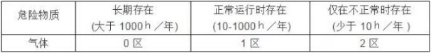 按場所中危險物質存在時間的長短,將兩類不同物態下的危險場所劃分為三個區,即:對爆炸性氣體環境,為0區、1區和2區;對可燃性粉塵環境,為20區、21區和22區。