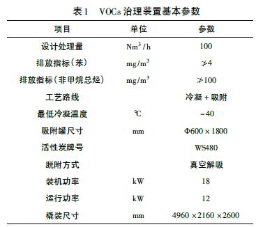 老罐區苯罐采用江蘇金門能源裝備有限公司設計、制造的JM - VRECS - CD/AD - 100 型VOCs 治理裝置,冷凝+ 吸附集成工藝,裝置主要參數如表1。