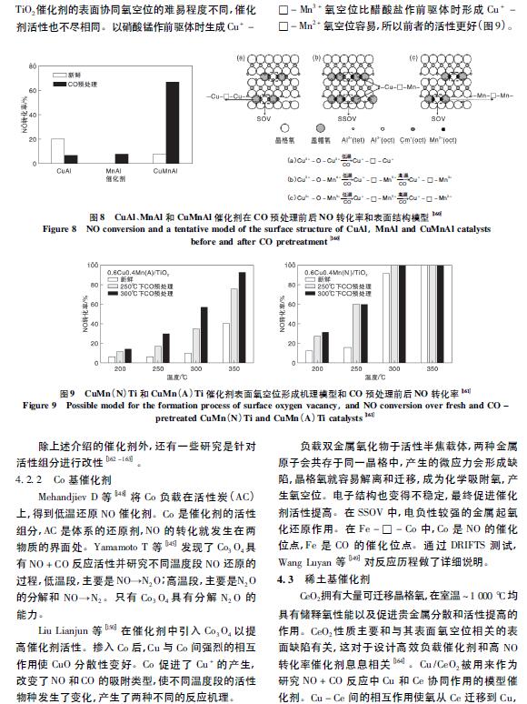 在CeTi 催化劑中,Ce 和Ti 在原子級別上的相互作用產(chǎn)生的Ce - O - Ti 有助于提高催化劑活性。Li Ping 等[75]用FETEM 直接觀察到Ce - O - Ti 結(jié)構(gòu),無定型Ce0. 3 TiO∞在( 175 ~ 400) ℃ 時(shí)的NO 轉(zhuǎn)化率為90%。此外,利用XANES 和原位FTIR 等證明了表面高度分散的Ce - O - Ti 結(jié)構(gòu)是反應(yīng)的活性中心。Chen Lei 等 利用溶膠- 凝膠法合成CuCeTi 催化劑,在( 150 ~ 250) ℃時(shí)的NO 轉(zhuǎn)化率大于80%,Cu 提供的L 酸位點(diǎn)成為反應(yīng)的活性中心,加速了低溫段快速SCR 反應(yīng)過程。在此基礎(chǔ)上進(jìn)行改進(jìn)( 圖5) ,在Ce - Ti 催化劑中摻雜了少量Cu2 + ,可以顯著提高催化劑的低溫SCR 活性。研究表明,Cu 與Ce 物質(zhì)的量比0. 005 時(shí),( 200 ~400) ℃的NO 轉(zhuǎn)化率為80%,N2選擇性為100%。Cu - O - Ce 的形成促進(jìn)了Ce4 + 向Ce3 + 的轉(zhuǎn)化,增加了表面活性氧。分散態(tài)Cu 增加了Ce -Ti 催化劑表面酸性,提高了NH3吸附能力,從而加速了反應(yīng)向E - R 機(jī)理方向進(jìn)行。在Ce - Ti 催化劑中摻雜W 可以在Ce - W 間產(chǎn)生強(qiáng)烈的相互作用,產(chǎn)生更多的Ce3 +、NOx 和NH3吸附物種,從而提高催化劑活性。Fu Mengfan 等發(fā)現(xiàn),采用共浸漬法時(shí),在( 200 ~ 400) ℃ 的NO 轉(zhuǎn)化率大于90%。利用均相沉淀法進(jìn)一步提高了Ce -W - Ti 催化劑在高空速下的活性,在Ce 與W 物質(zhì)的量比1∶ 1、空速500 000 h - 1和溫度( 275 ~ 400) ℃條件下,NO 轉(zhuǎn)化率為90%。W 的引入促進(jìn)了活性Ce 的分散,增加了催化劑表面活性CeO2晶體、氧空位和酸位。在低溫段( < 300 ℃) ,W 促進(jìn)了NO 向NO2的氧化,在高溫段( > 300 ℃) ,W 提高了N2選擇性。